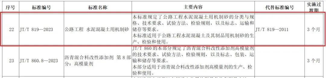 近日,交通運(yùn)輸部發(fā)布29項(xiàng)交通運(yùn)輸行業(yè)標(biāo)準(zhǔn)的公告,其中有標(biāo)準(zhǔn)編號(hào)為JT/T 819—2023的《公路工程水泥混凝土用機(jī)制砂》。這標(biāo)志著,在我國(guó)公路工程領(lǐng)域,水泥混凝土用機(jī)制砂正式有了新的行業(yè)標(biāo)準(zhǔn),這將大大促進(jìn)機(jī)制砂在該領(lǐng)域的推廣應(yīng)用。